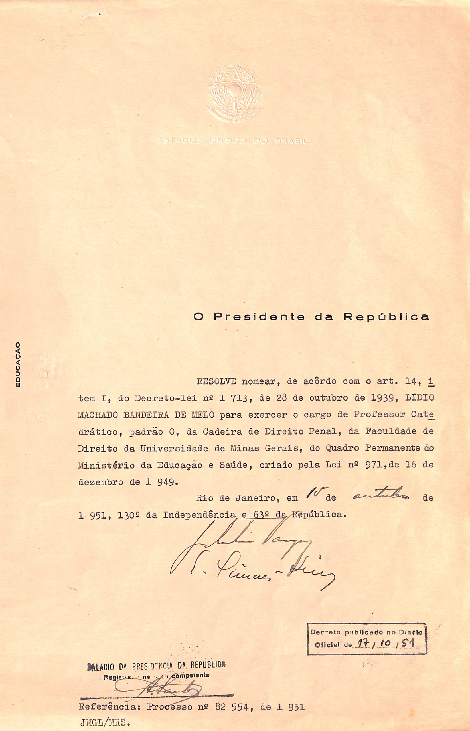 Lydio fez concurso em 1951 para a cadeira de Direito Penal da Faculdade de Direito da Universidade de Minas Gerais (UMG), antiga Faculdade Livre de Direito de Minas Gerais. A universidade havia sido federalizada em 1949, mas só receberia o “Federal” no nome em 1965.